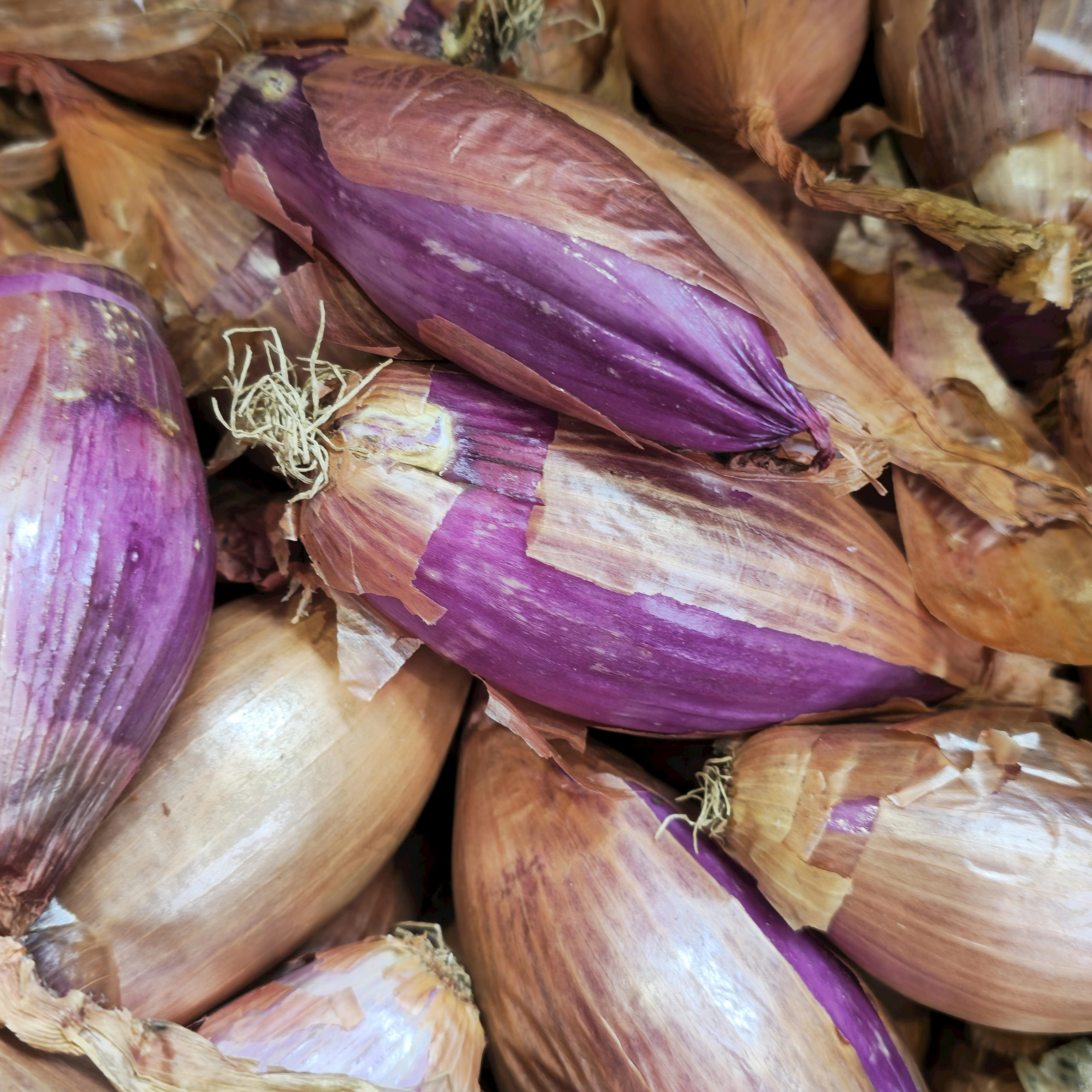 Short and flat with a coppery red outer skin that peels easily to reveal a reddish-purple flesh. Excellent flavor; great in sauces. This one can produce tenfold.